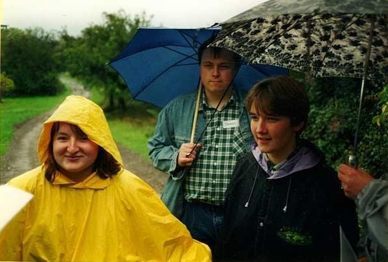 1993 - Das erste Weekend in Sinzig - Melanie, Thomas und Nicole während der total verregneten Schnitzeljagd - during the totally rained out paper chase